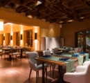 The goal was to lower the overall noise level (reverberation time) while maintaining a lively atmosphere. We strategically placed stylish acoustic baffles and unique wall art to ensure clear conversation without overwhelming table noise.